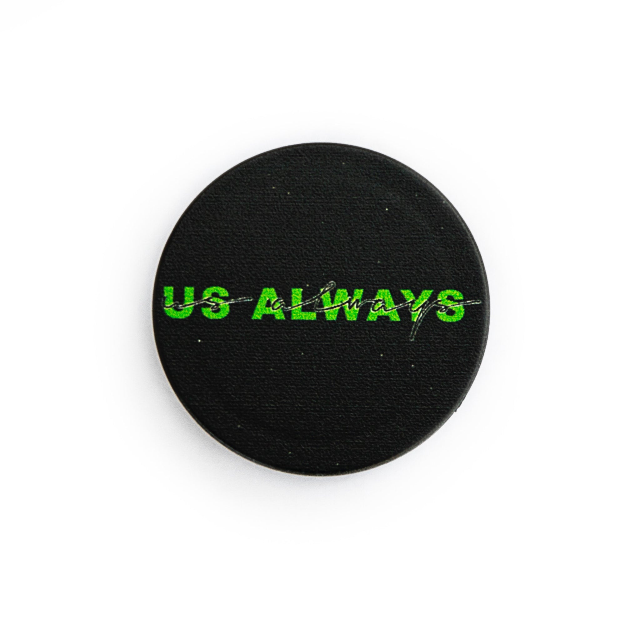 Neon green logo on black base.